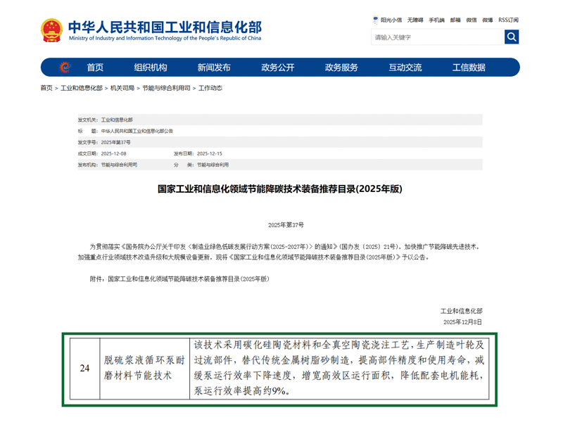 近日,工業(yè)和信息化部正式發(fā)布《國家工業(yè)和信息化領域節(jié)能降碳技術裝備推薦目錄(2025年版)》,石家莊科宏泵業(yè)有限公司的脫硫漿液循環(huán)泵耐磨材料節(jié)能技術成功入選,標志著該項技術在節(jié)能降碳方面的先進性與應用價值獲國家推薦。