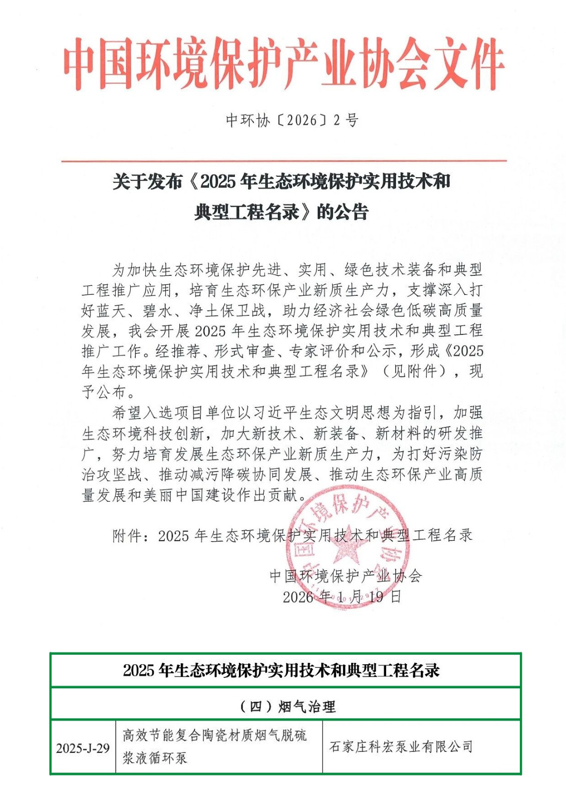 2026年1月19日,中國環(huán)境保護產(chǎn)業(yè)協(xié)會正式發(fā)布《2025年生態(tài)環(huán)境保護實用技術(shù)和典型工程名錄》,石家莊科宏泵業(yè)有限公司的高效節(jié)能復(fù)合陶瓷材質(zhì)煙氣脫硫漿液循環(huán)泵成功入選,標(biāo)志著我司研發(fā)生產(chǎn)的脫硫漿液循環(huán)泵在生態(tài)環(huán)境科技創(chuàng)新,發(fā)展生態(tài)環(huán)保產(chǎn)業(yè)新質(zhì)生產(chǎn)力與推動減污降碳協(xié)同發(fā)展方面獲得國家認(rèn)可和推薦。